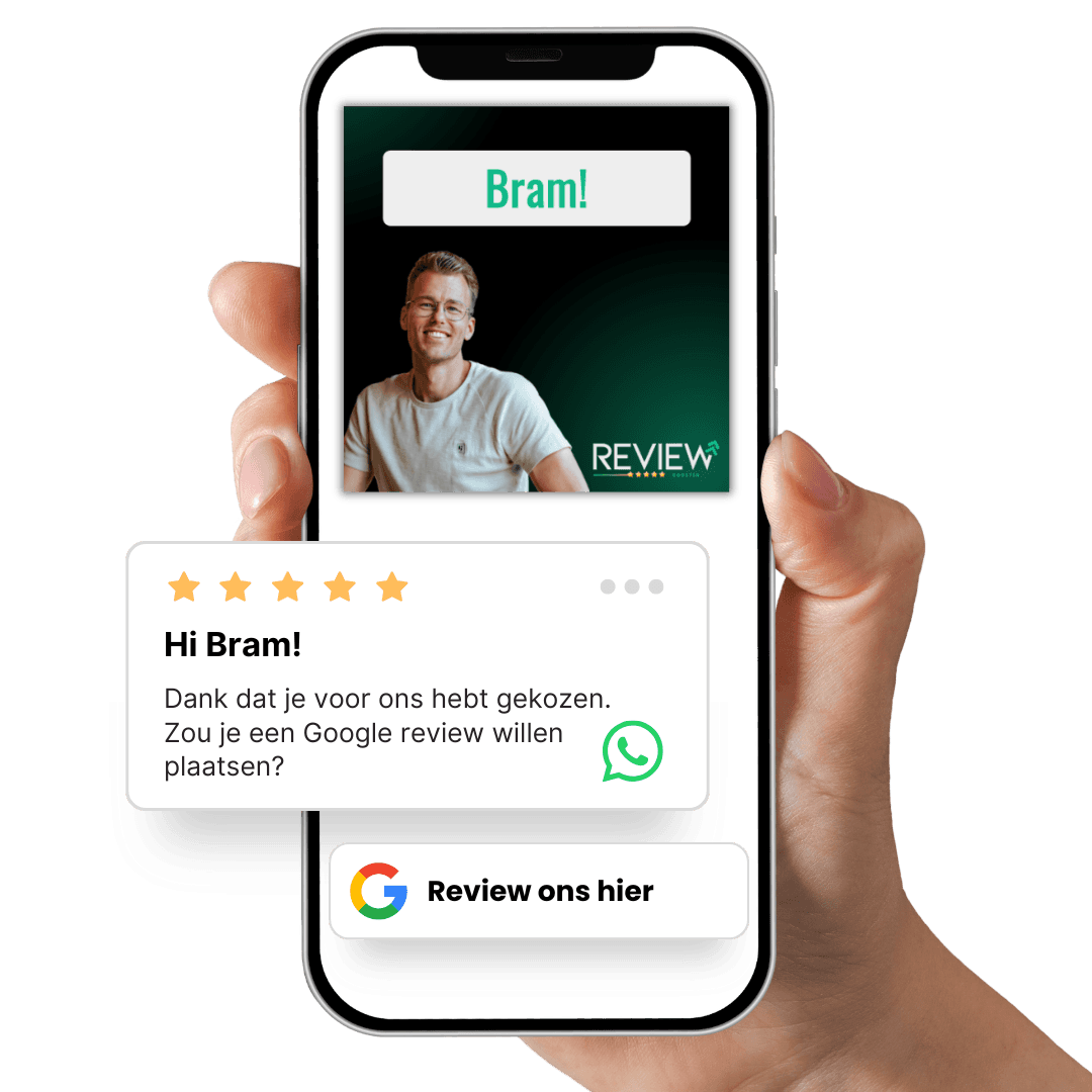 Reviewverzoeken gaan automatisch uit via WhatsApp en e-mail – met jouw naam en gezicht erbij. Persoonlijk en schaalbaar