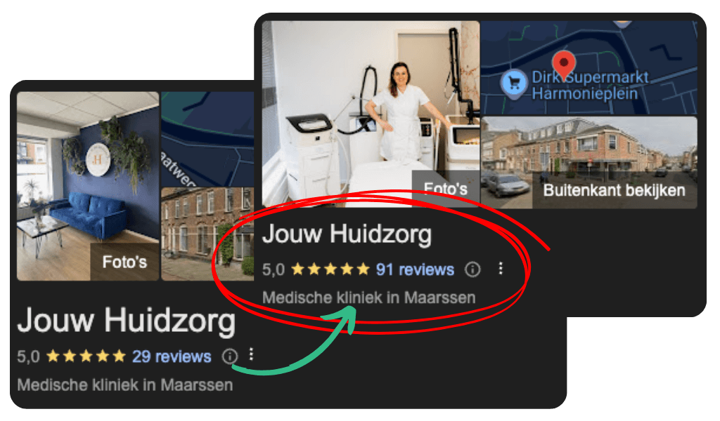 Toen Saskia Gooren – eigenaresse van Jouw Huidzorg in Maarssen – via via over mij hoorde, zaten er 29 reviews op haar Google-profiel. Allemaal 5 sterren, dus aan kwaliteit geen gebrek. Alleen: haar concurrenten stonden boven haar. En dat voelde krom.